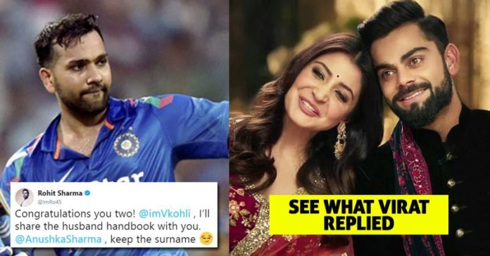 However, Indian cricketer Rohit Sharma’s tweet to Virushka grabbed much attention and highlight, as he wished them in a different way. Taking into consideration the fact that he is already married, he said that he would share the husband handbook with Virat and at the same time, he asked Anushka not to change her surname to “Kohli” from “Sharma”.