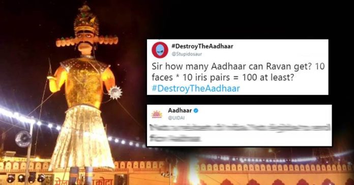 Sir how many Aadhaar can Ravan get? 10 faces * 10 iris pairs = 100 at least? #DestroyTheAadhaar https://t.co/b7BPAxIEuK— #DestroyTheAadhaar (@Stupidosaur) September 30, 2017