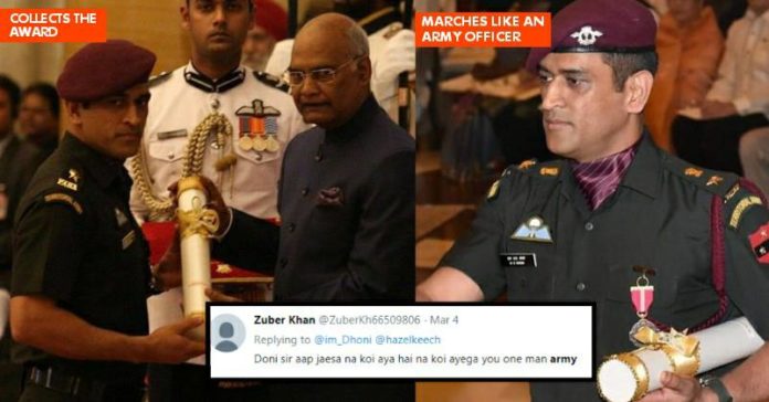 Dhoni carries the Army uniform really well and with lot of pride. So good to see…..#PadmaBhushan #PadmaAwards #MSDhonipic.twitter.com/fENZyO60BZ— Subir Khanna (@Subir_khanna) April 2, 2018