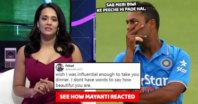She is presently busy with the coverage of IPL 2018 that started on 7th April and is going on. A Twitter user named Fahad (Twitter handle – @fahadkhan616) tried to impress Mayanti and indirectly asked her for a dinner date. Praising her beauty, he tweeted,