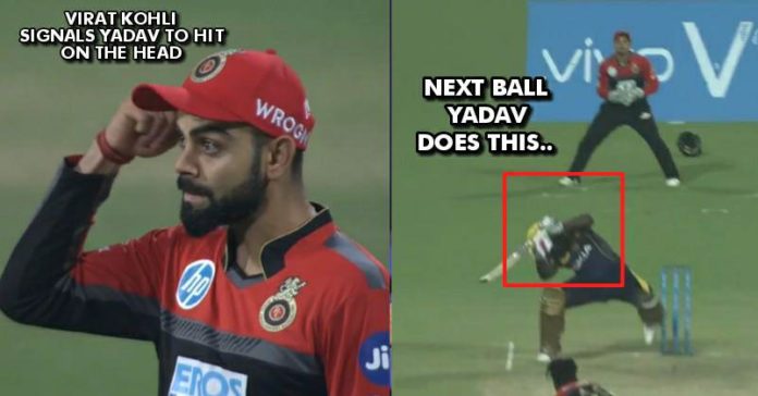 But RCB managed to take quick wickets and when top 5 batsmen of KKR were sent to pavilion, Virat knew that there is not much batting left after Dinesh Karthik and Andre Russell so he indicated his bowler to do something that may be called against the spirit of sportsmanship.